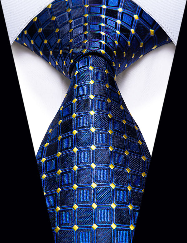 YourTies Golden Blue Plaid Silk Necktie with Golden Tie Clip