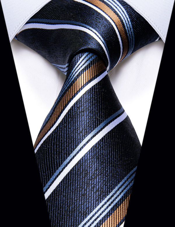 YourTies Dark Blue White Golden Jacquard Striped Silk Necktie
