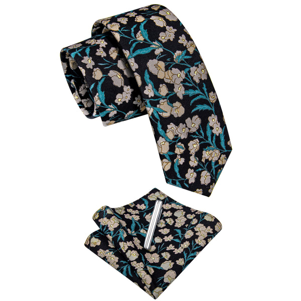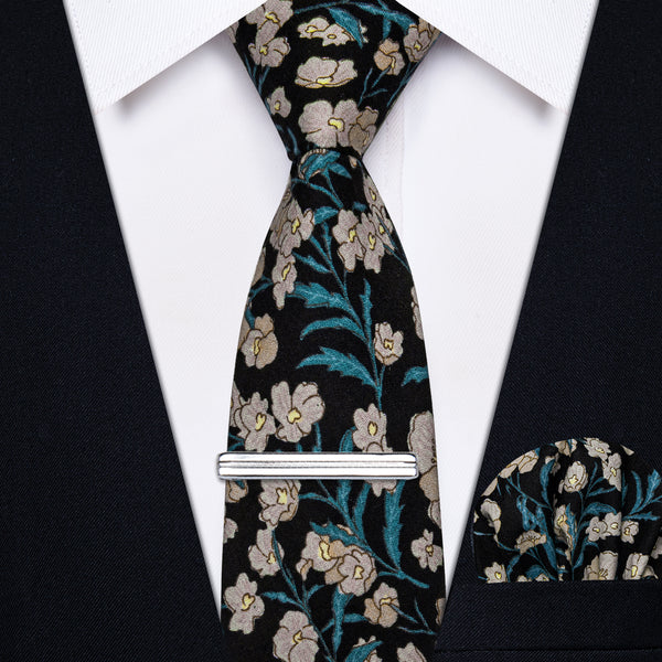 YourTies Black White Grey Floral Necktie Pocket Square Cufflinks Set