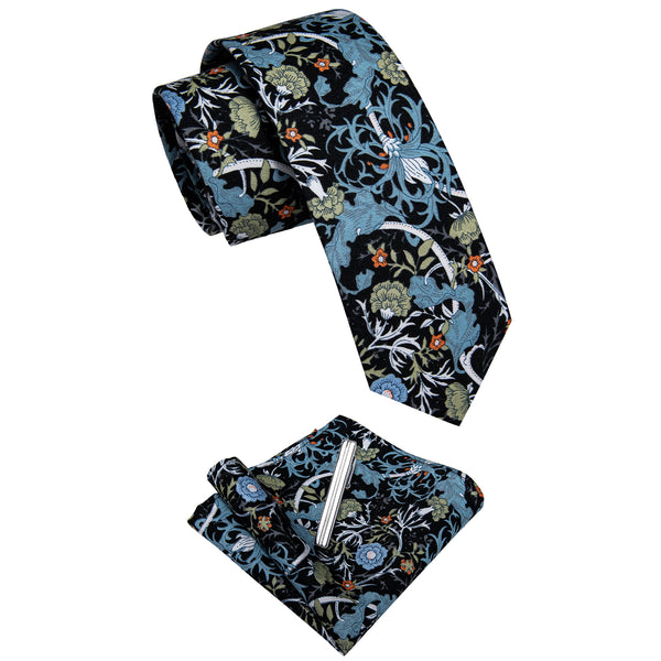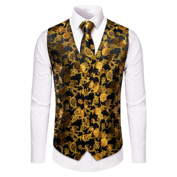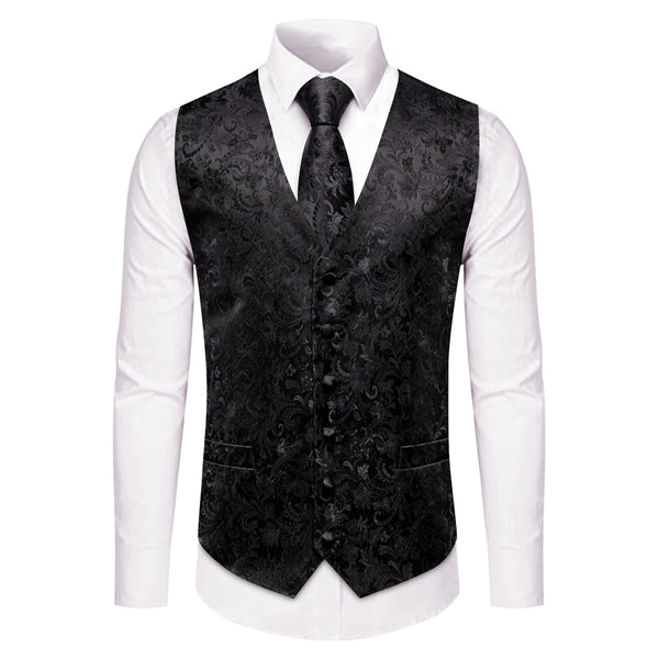YourTies Black Floral Silk Men Vest Necktie Handkerchief Cufflinks Set
