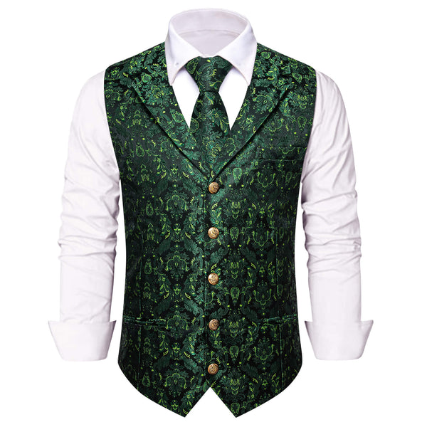 YourTies Green Black Floral Leaf Silk Men's Vest Necktie Hanky Cufflinks Set