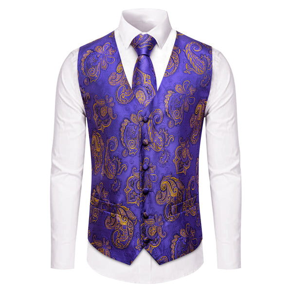 YourTies Purple Gold Paisley Vest Necktie Handkerchief Cufflinks Set