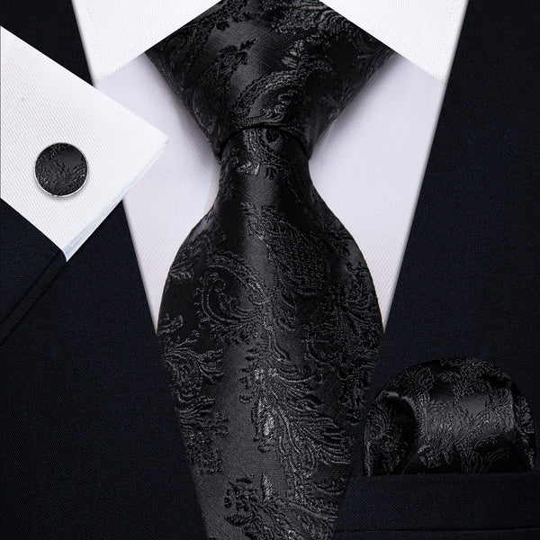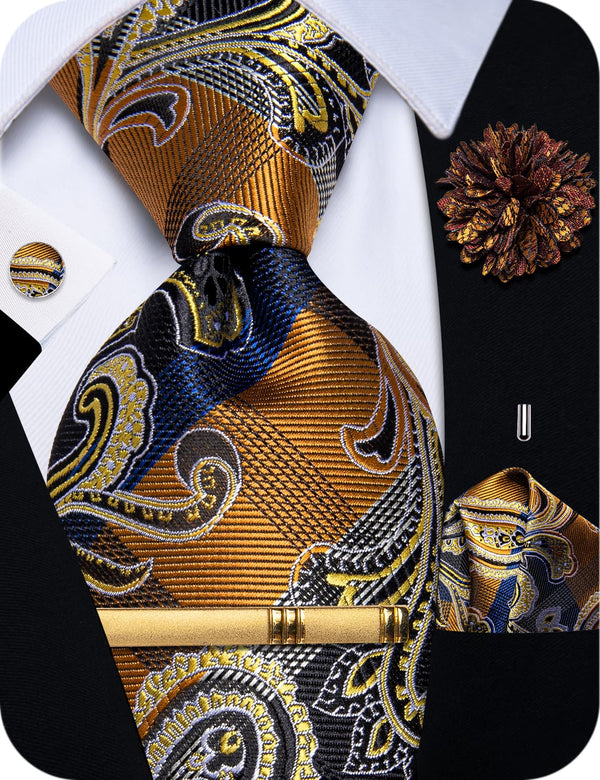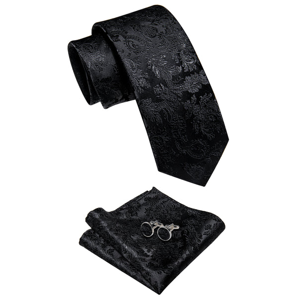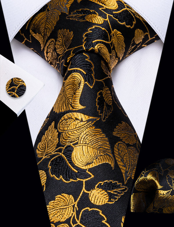 YourTies Black Gold Floral Men's Necktie Pocket Square Cufflinks Set