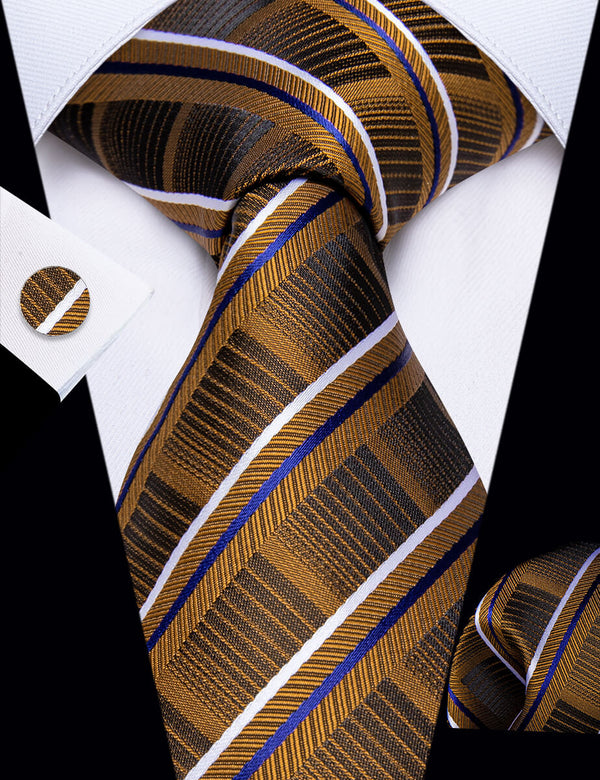 YourTies Brown Blue White Striped Men's Necktie Pocket Square Cufflinks Set