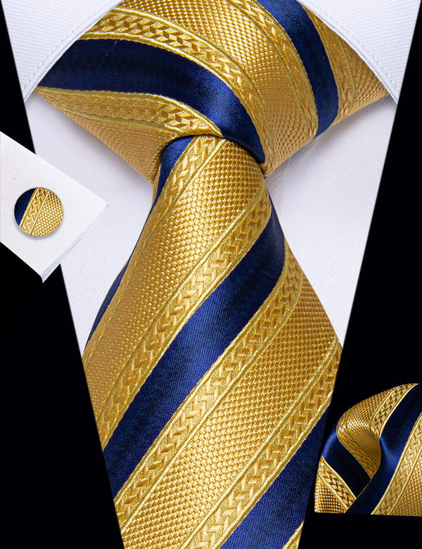 Yourties Gold Yellow Navy Striped Necktie Pocket Square Cufflinks Set