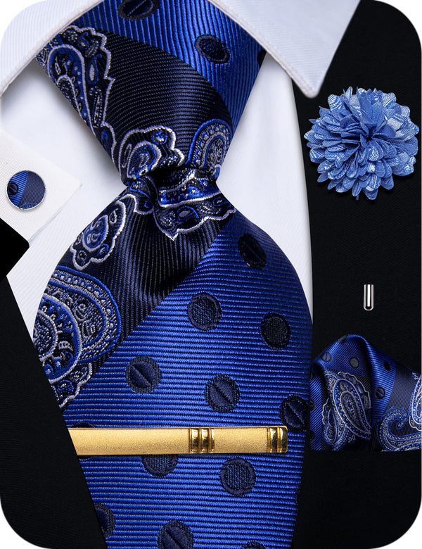 YourTies Blue Tie Navy Blue Dots Men's Novelty Wedding Brooch Tie Set