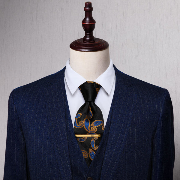 YourTies Gold Black Men's Vest Necktie Handkerchief Cufflinks Set