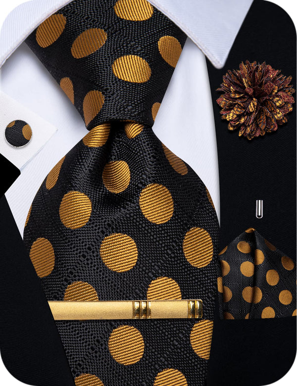 YourTies Men's Tie Black Gold Polka Dots Necktie Brooch Clip Set