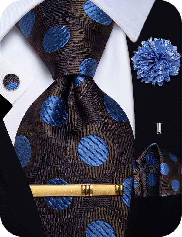 YourTies Brown Tie Blue Dots Necktie Floral Brooch Metal Tie Bar Set