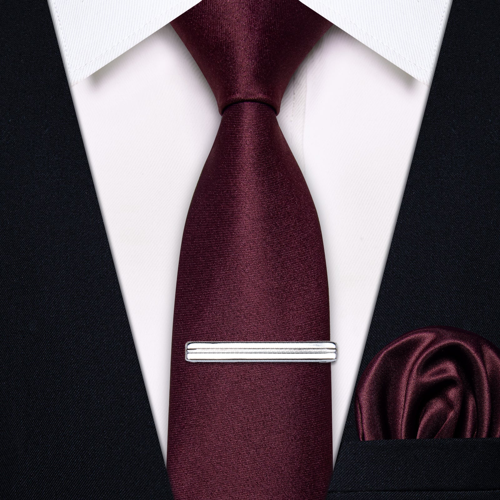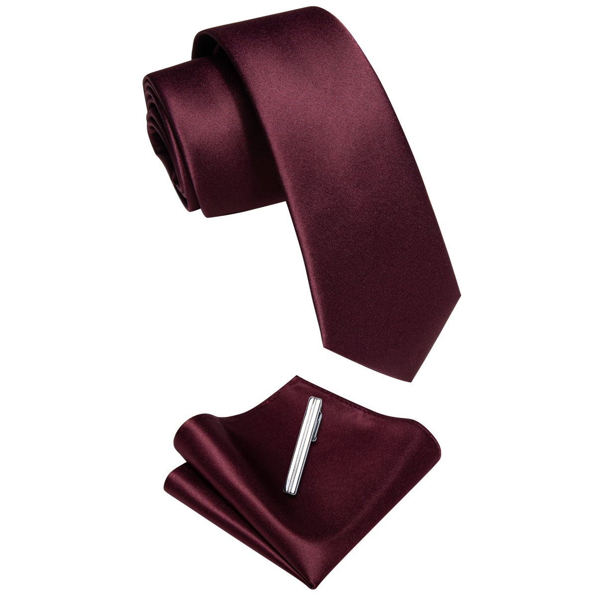 YourTies Burgundy Solid Skinny Necktie Pocket Square Set with Tie Clip