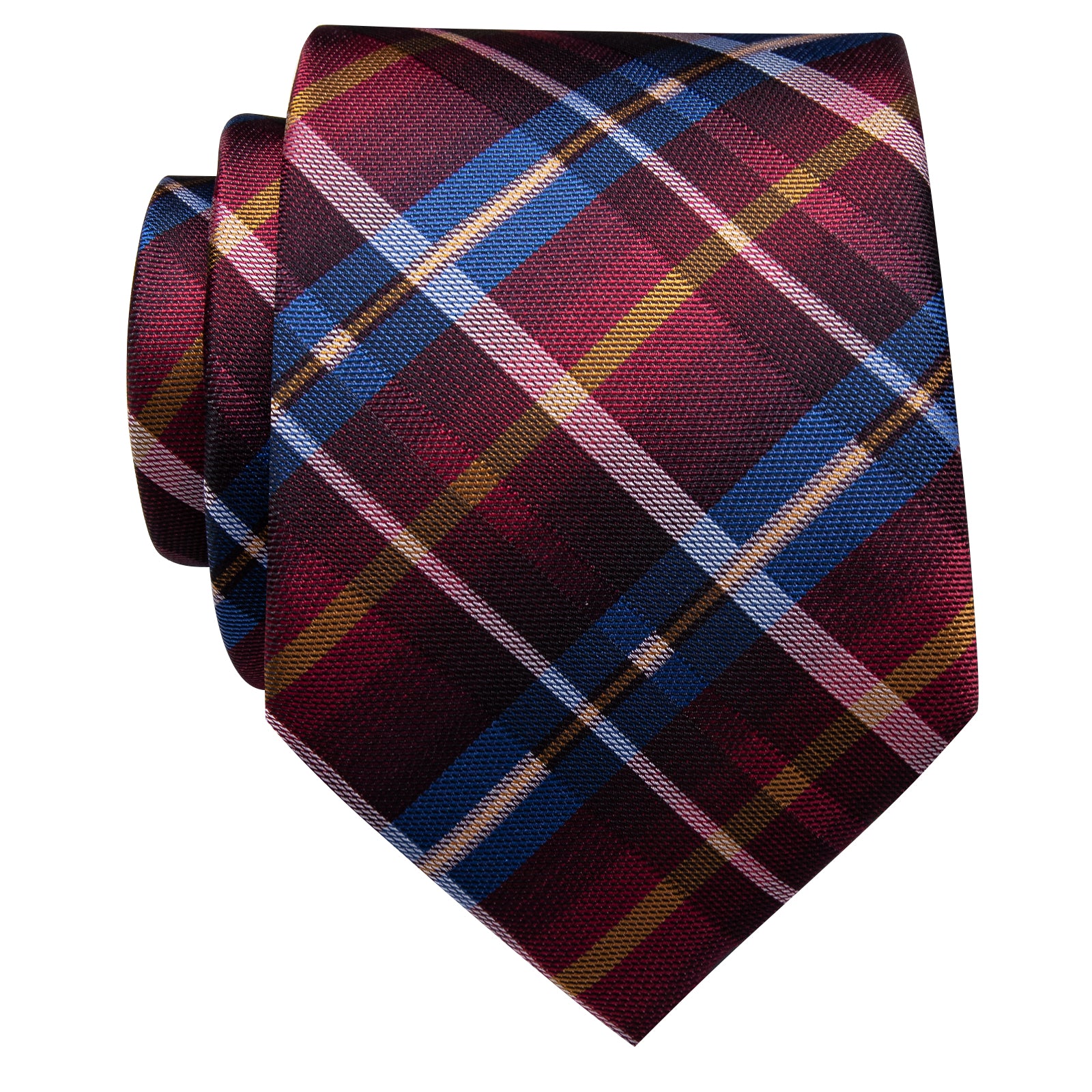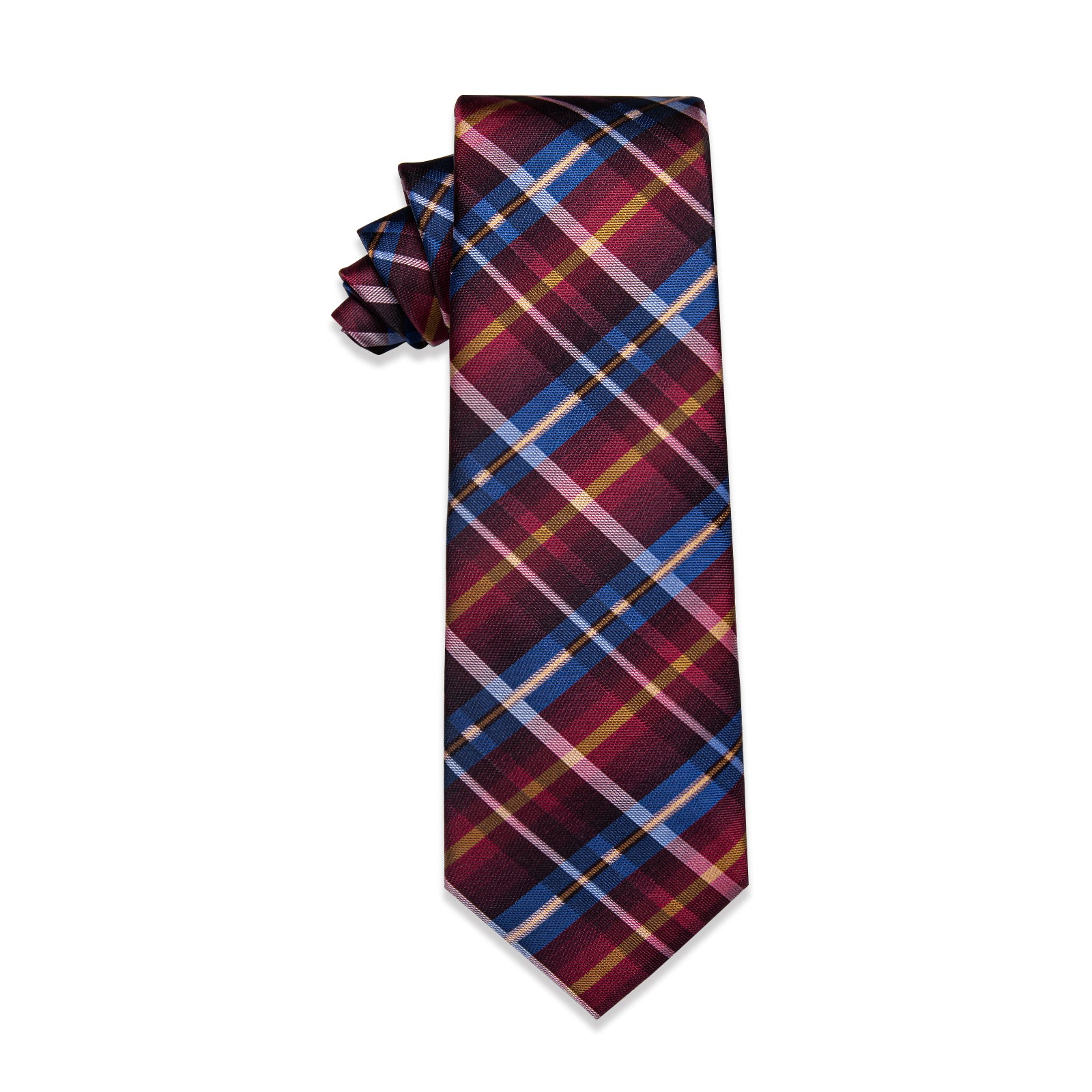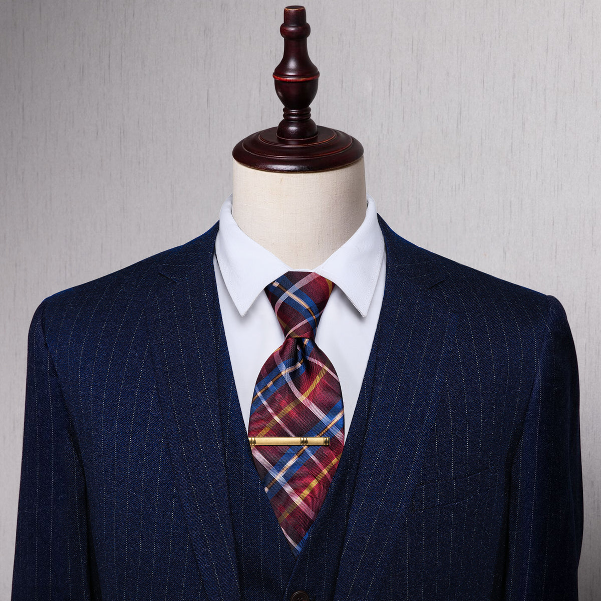YourTies Burgundy Blue England Plaid Silk Necktie with Golden Tie Clip