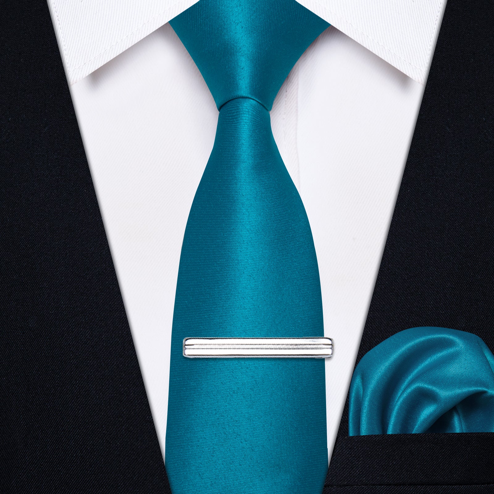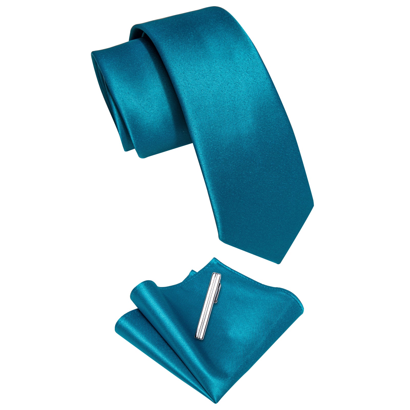 YourTies Teal Blue Solid Skinny Necktie Pocket Square Set and Tie Clip