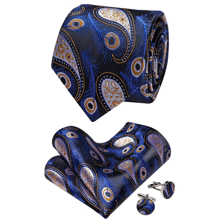 Light Steel Blue Orange Peacock Feathers Novelty Neck Tie Set