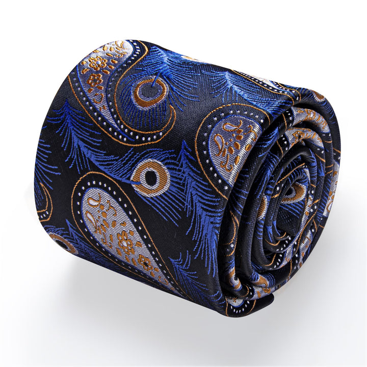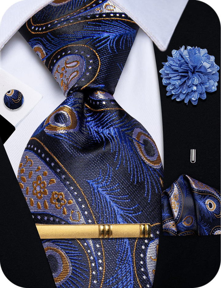YourTies Light Steel Blue Orange Peacock Feathers Novelty Neck Tie Set