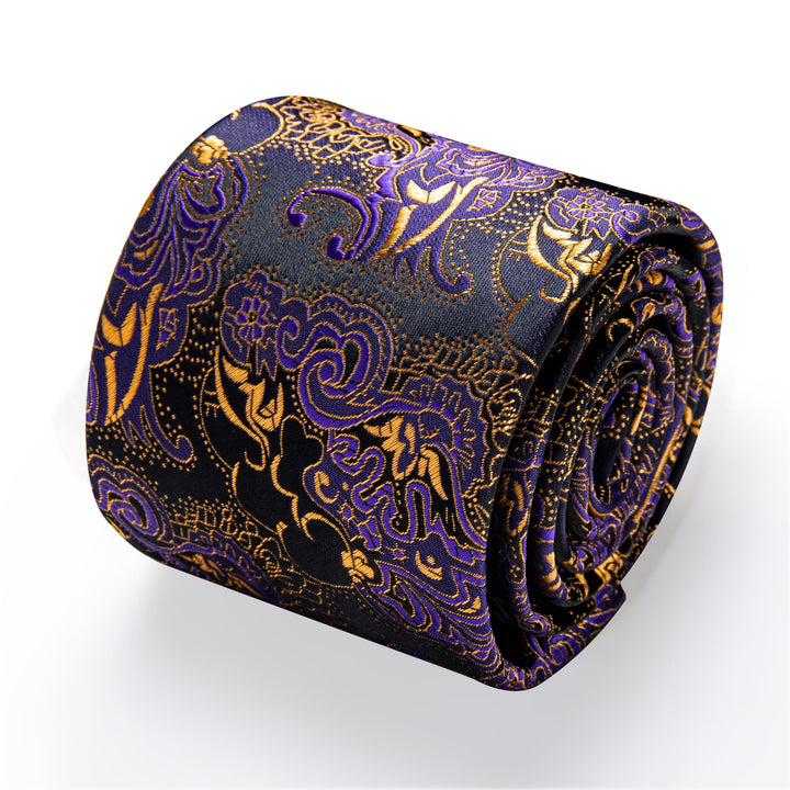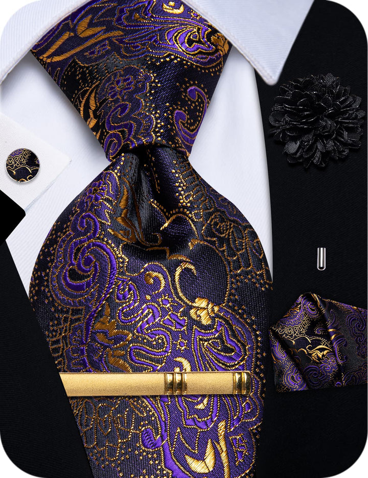 Purple Tie Black Gold Paisley Jacquard Necktie for Suit Casual