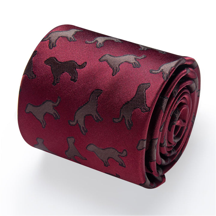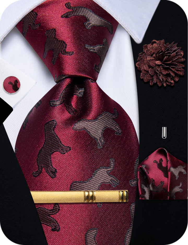 Red Tie Burgundy Brown Puppy Jacquard Novelty Necktie Set