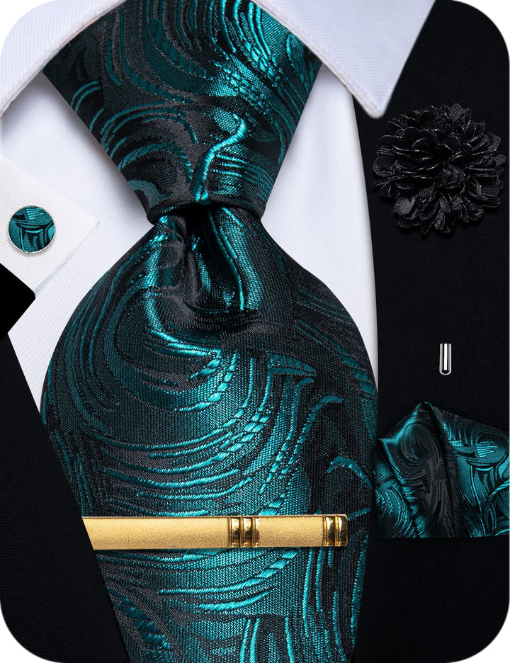 Teal Tie for Men Black Blue Green Jacquard Formal Necktie Set